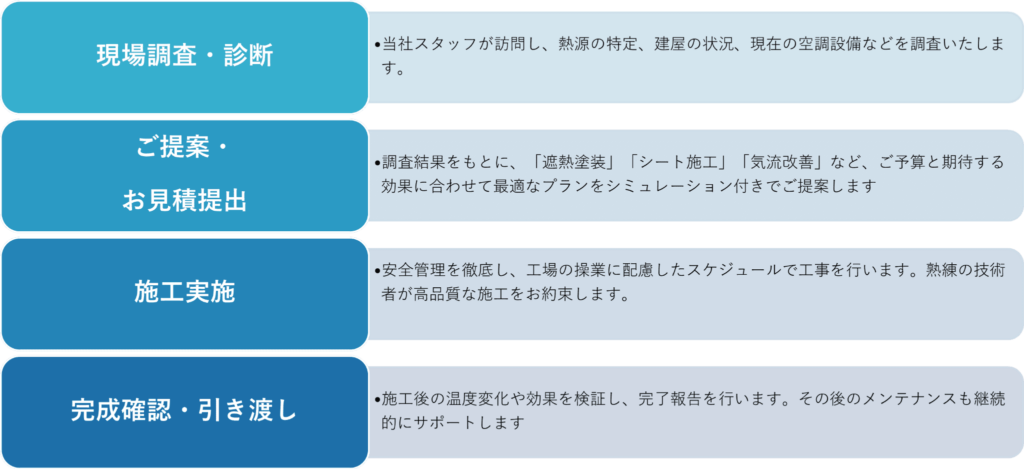 工場の暑さ対策において最も重要なことは、「熱の根本原因」を正しく把握し、優先順位をつけて対策を講じることです。例えば、屋根からの熱侵入が主原因であるにもかかわらず、高額なスポットエアコンを増設しても、期待する効果は得られずランニングコストだけが増大してしまいます。逆に、強力な熱源がある工程では、建屋全体の断熱よりも局所排気や熱源そのものの断熱(保温)が有効な場合もあります。そこで、強くお伝えしたいのが、「現場の全体最適」です。長年、製鉄所をはじめとする過酷な製造現場で培ってきた経験から、カタログスペックだけでは分からない「現場で本当に効く対策」をご提案します。 単なる機器の納入業者としてではなく、お客様の生産設備や操業条件を深く理解したパートナーとして、現場調査から施工、アフターサービスまで一貫対応いたします。