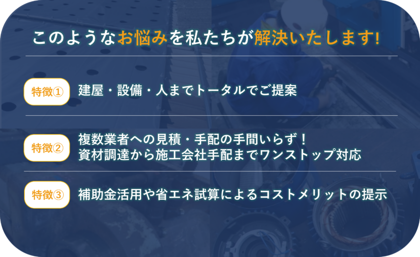 特定のメーカー製品を売るだけの商社とは異なり、当社は「建屋(全体)」「設備(局所)」「作業者(個人)」の3つのレイヤーすべてに対応可能です。